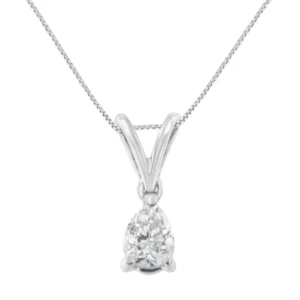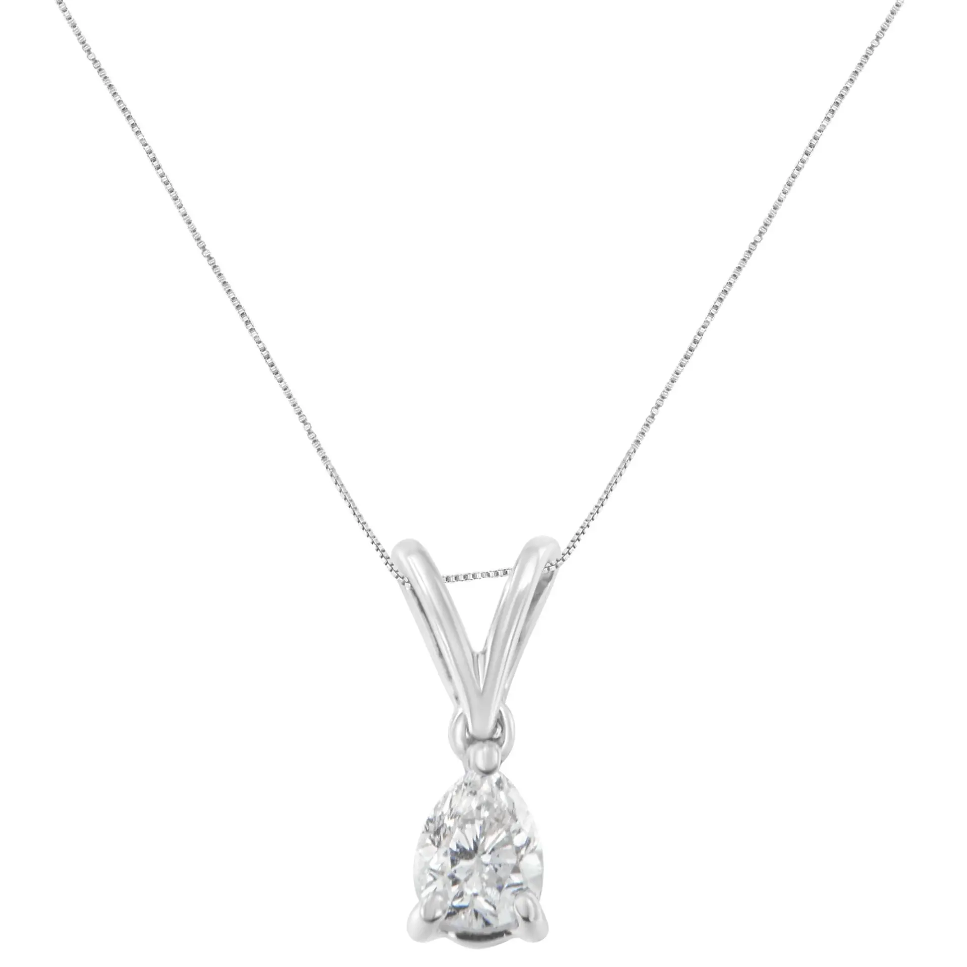 This classic design features a solitaire pear cut diamond hanging from a delicate chain. A timeless design to last a lifetime. It is crafted in 10 karat white gold and has a total diamond weight of 1/5 carats.