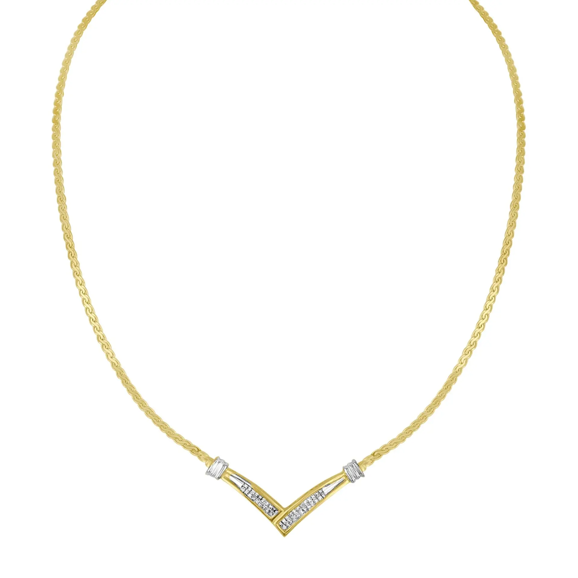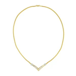 This stunning 10K yellow and white gold pendant necklace features a flared V shaped pendant inset with two rows of invisible set, princess cut diamonds inside a yellow gold border with white gold inside the V and on the outsides of the V shape. The necklace has a wide franco chain with a lobster claw clasp. The contemporary yet classic 18″ necklace complements any neckline beautifully. This authentic design is crafted of real 10 karat gold, a precious metal that will keep a tarnish-free shine for years to come. This sweet necklace makes a great gift for any special occasion! Whether worn for daytime glamour or evening sparkle, this necklace is gorgeously versatile. Coordinate it with your favorite diamond earrings or other diamond jewelry to create a complete and elegant ensemble. It’s a classic and feminine piece she’ll want to show off every day.