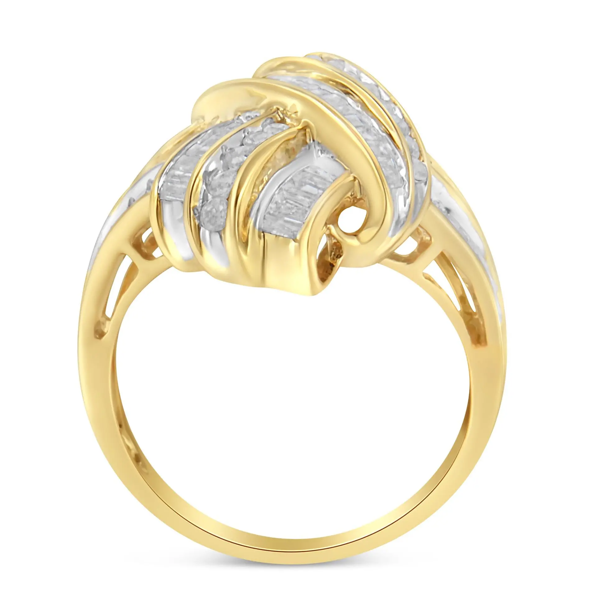 Add a touch of a glamour to your outfit with this fabulous diamond ring. Created with the finest 10k yellow gold, this piece is embellished with 25 round diamonds and 50 baguette diamonds in a channel setting. The total diamond weight is 1.2 ct, which makes it the perfect accessory for any night out.