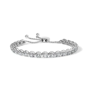 Indulge in the epitome of sophistication with our Diamond Adjustable Bolo Tennis Bracelet. Crafted from radiant 14K white gold, it exudes timeless elegance. Adorned with 25 natural round diamonds totaling 6.0 cttw, they shimmer with undeniable brilliance. Set in secure 4-prong settings, the I-J color diamonds add a touch of luxury to any ensemble. The adjustable clasp ensures a perfect fit for wrist sizes 4-10, making it a versatile and stylish accessory for any occasion. Elevate your look with the captivating allure of diamonds, radiating grace and glamour with every movement. The white gold is plated for rhodium for extra shine.