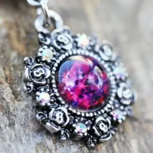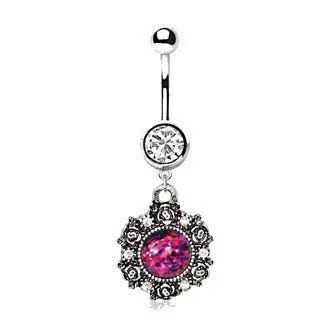 Navel Ring / Belly Button Ring with a Victorian style pendant dangle Pendant features Red oval center with flowers and CZ surrounding it Multiple Aurora Borealis CZ in between flower designs Press Fit / Bezel Set Clear CZ on the top ball Bar Thickness : 14GA | 1.6mm Bar Length : 3/8″ | 10mm Pendant Size : 17 x 17mm Material : 316L Stainless Steel, Zinc Alloy, Cubic Zirconia