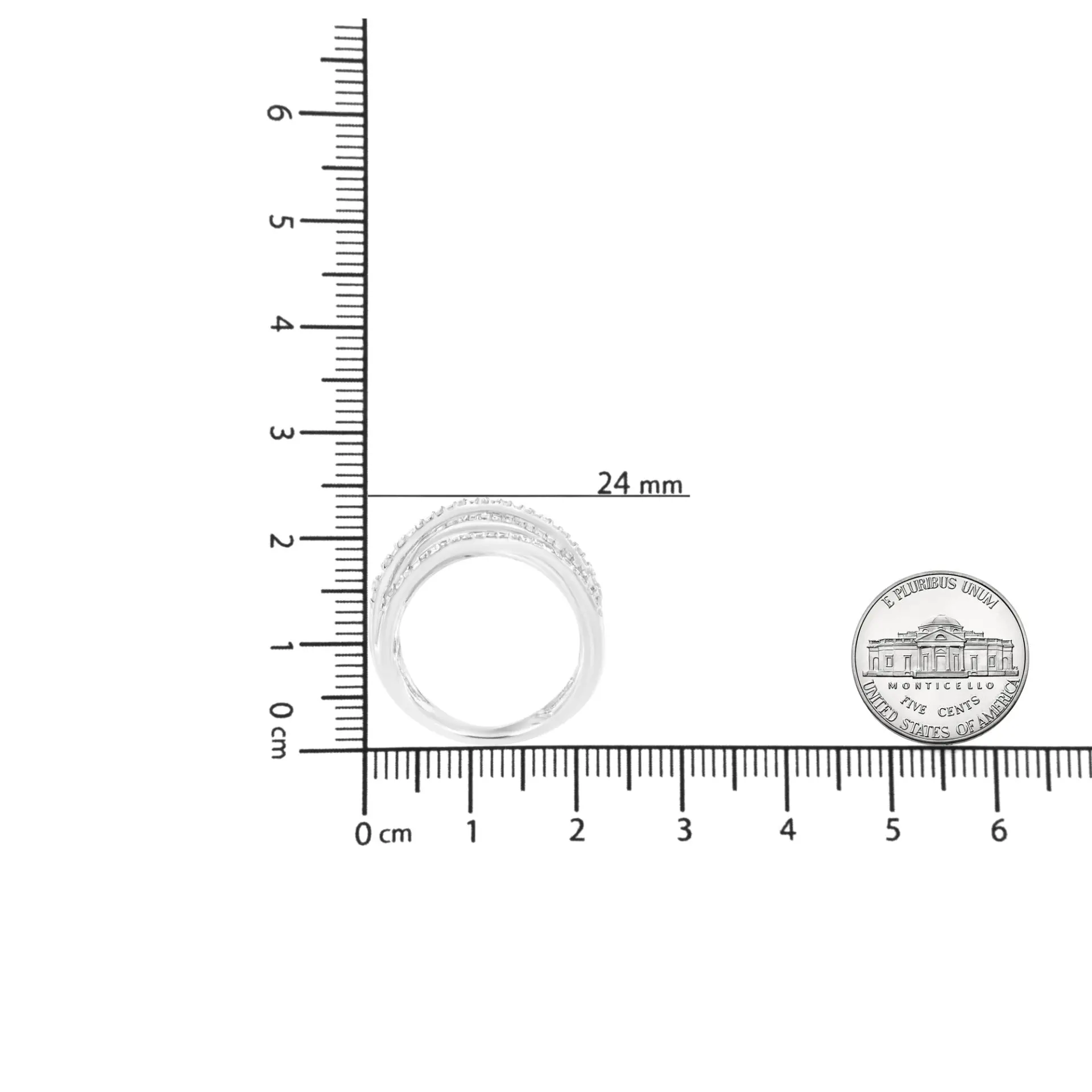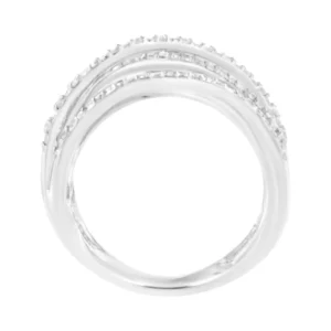 This gorgeous bypass ring has an intricate design of .925 sterling silver weaving together across the center of the piece. This stunning ring is set with an impressive total diamond weight of 1/4 cttw. Round-cut diamonds are embellished into the silver in an elegant prong setting. This piece will be your staple piece in your jewelry collection.