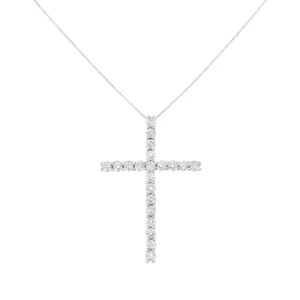 This beautiful piece of jewelry is not only a symbol of devotion and faith but also a true work of art. This gorgeous .925 sterling silver pendant necklace features round, brilliant cut diamonds in a cross design. This diamond cross pendant comes with a matching box chain necklace with a spring ring clasp. The contemporary yet classic 18 box chain complements any neckline beautifully. This authentic design is crafted of real 92.5% sterling silver that has been electro-coated with genuine rhodium (a platinum-family metal), ensuring it will keep a tarnish-free shine for years to come. Whether worn for daytime glamour or evening sparkle, this necklace is gorgeously versatile. It’s a classic and feminine piece she’ll want to show off every day. A brilliant beacon of faith and hope, our stunning Sterling Silver Diamond Cross Pendant Necklace has been designed to be a dazzling reminder of optimism and confidence to anyone who wears it.