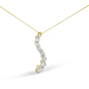 Introducing an AGS certified diamond pendant necklace, a piece of art that embodies the perfect journey of love. Crafted from luxurious 14K yellow gold, this necklace features a total of 62 natural diamonds, including 8 brilliant round-cut and 54 stunning baguette-cut diamonds. The diamonds weigh a total of 3.0 cttw, radiating a bright and sparkling light that illuminates the whole room. The diamond color is G-H, while the clarity is SI2-I1, giving each diamond a remarkable brilliance and a breathtaking sparkle. The diamonds are perfectly set in prongs and channels to ensure maximum light reflection and an elegant design that will turn heads wherever you go. This necklace is designed to be worn every day or for special occasions, with a comfortable 18″ box chain that sits perfectly on the neckline. The spring ring clasp provides a secure and reliable closure, giving you peace of mind and allowing you to wear it with confidence. This AGS certified diamond pendant necklace is the perfect gift for yourself or a loved one, and its timeless design and exceptional quality will make it a cherished addition to your jewelry collection for years to come. Order now and experience the luxury and beauty of this stunning diamond necklace.
