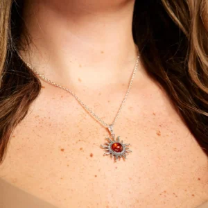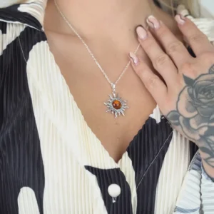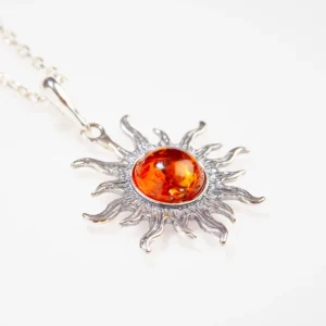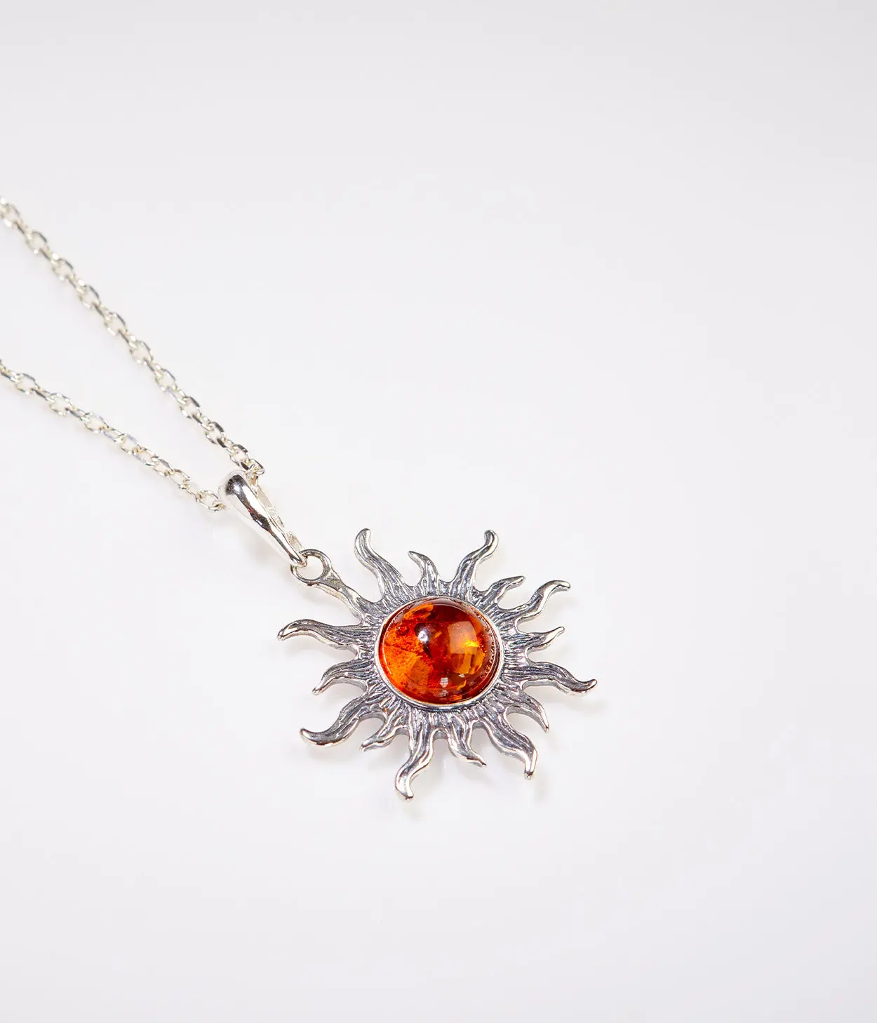 This sun charm pendant has been made with incredible attention to detail. The sterling silver rays are carefully shaped with very intricate surface detail. The amber centrepiece is rounded-off at the top and flat on the reverse – meaning that it catches the light offering a deep fiery cognac colour.