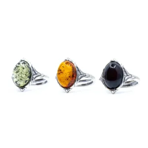 Aboho inspiredring with a delicately oxidised, textured frameand Cherry Red Amber centrepiece.