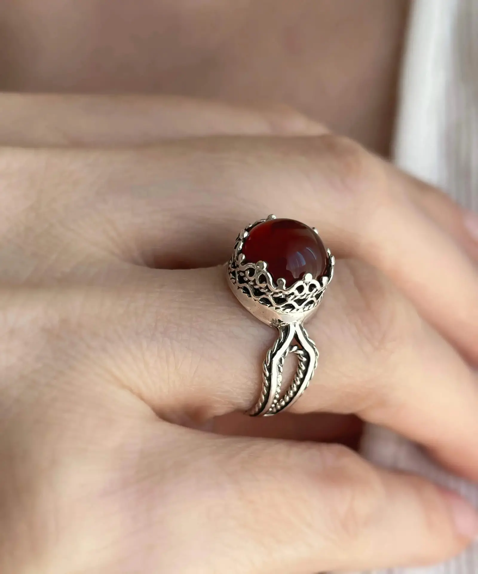 Looking for a versatile and stylish addition to your jewelry collection? Look no further than this elegant Filigree Cocktail Ring! Made of 925 sterling silver, this ring features a striking carnelian gemstone and cabochon round cut gemstone that will turn heads wherever you go. Perfect for everyday wear or special occasions like date night or a wedding anniversary, this ring is also a thoughtful gift for holidays like Christmas, Thanksgiving (Nov. 21-25), Mother’s Day, or a birthday.