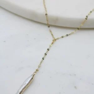 A gold chain tassel necklace with an elegant gold dipped pearl drop. Available in gold.