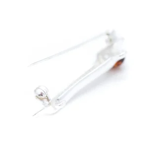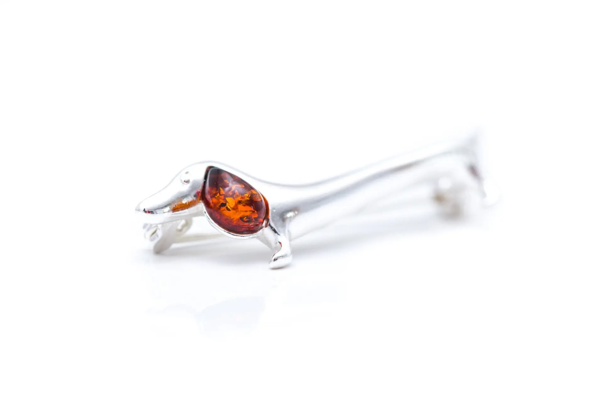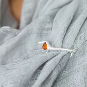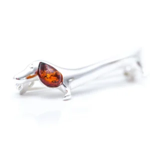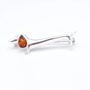 This quirky brooch is a cute accessory for dog lovers everywhere. Featuring a sterling silver sausage dog body and a bright baltic amber gemstoneear.