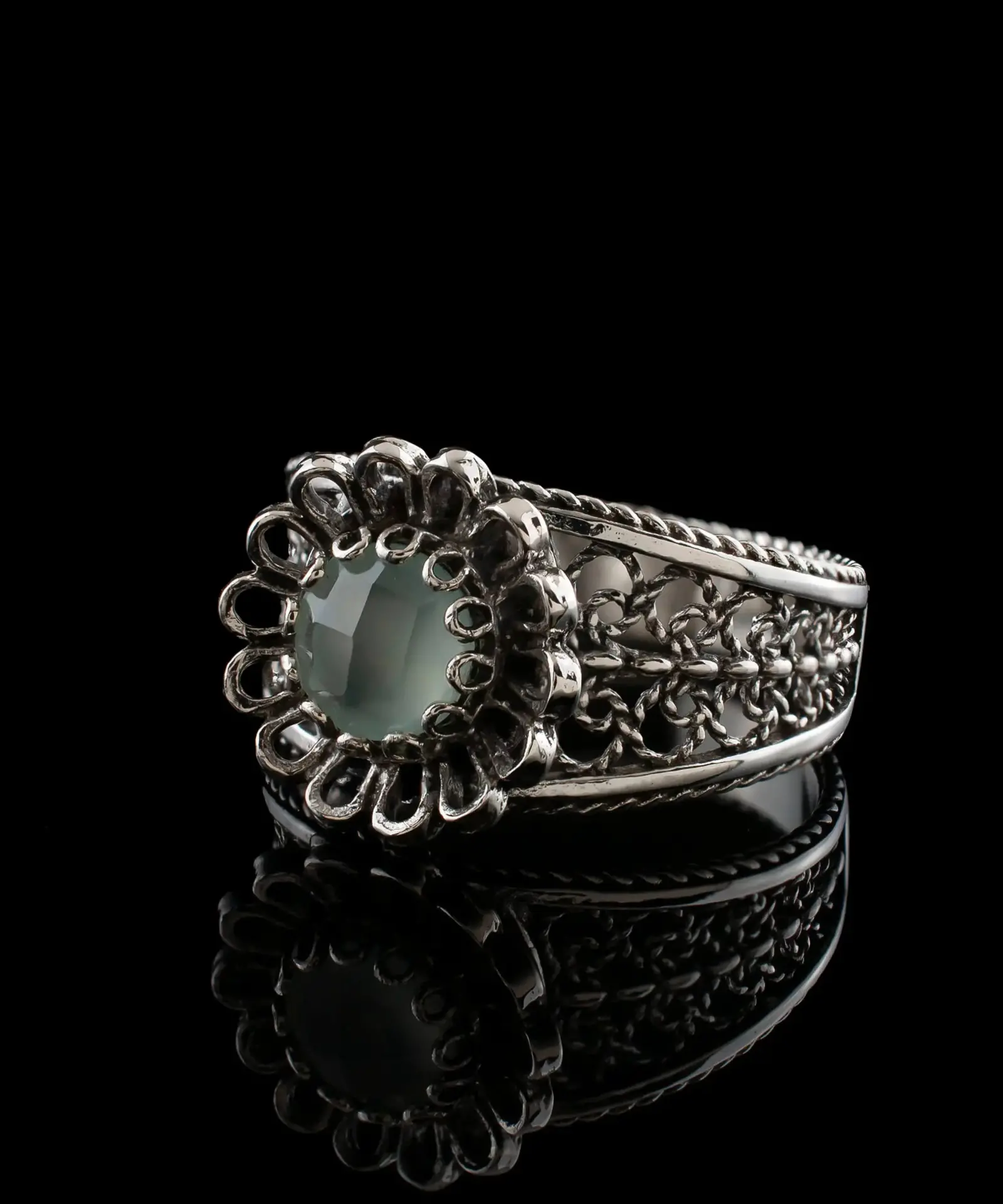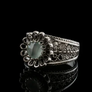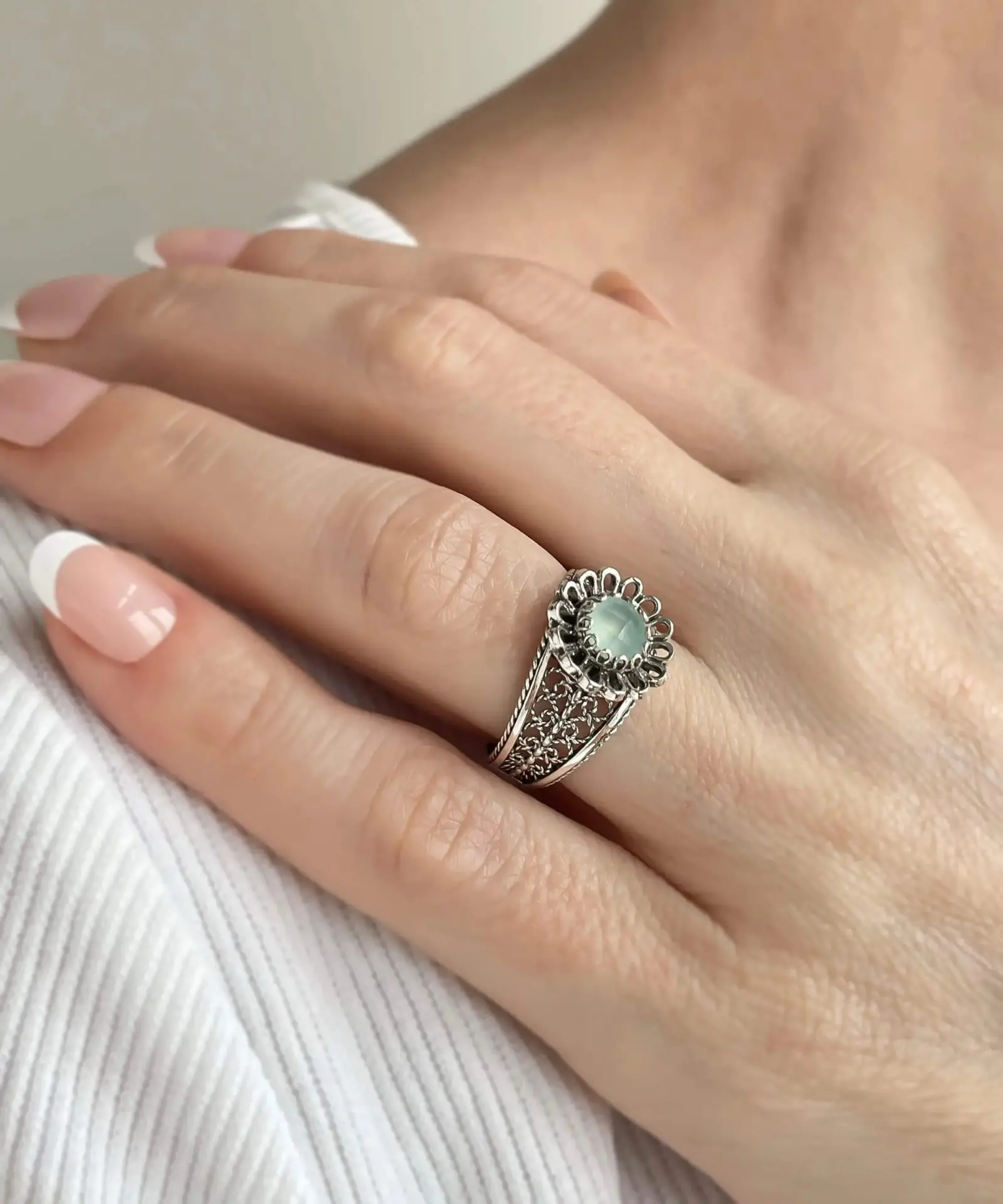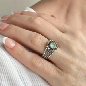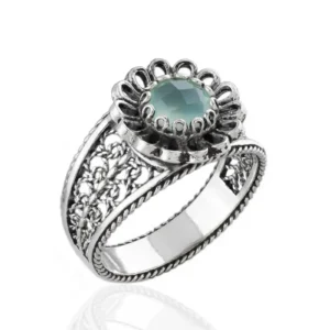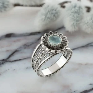 Indulge in the elegance of this 925 sterling silver Filigree Cocktail Ring with a charming daisy pattern. The ring’s front is adorned with a stunning blue aqua chalcedony gemstone, faceted with a checkerboard round cut, for a truly unique touch. Whether you’re dressing up or dressing down, this dainty ring is perfect for everyday wear or special occasions like anniversaries or date nights.