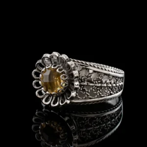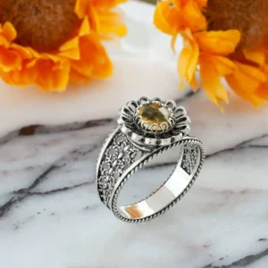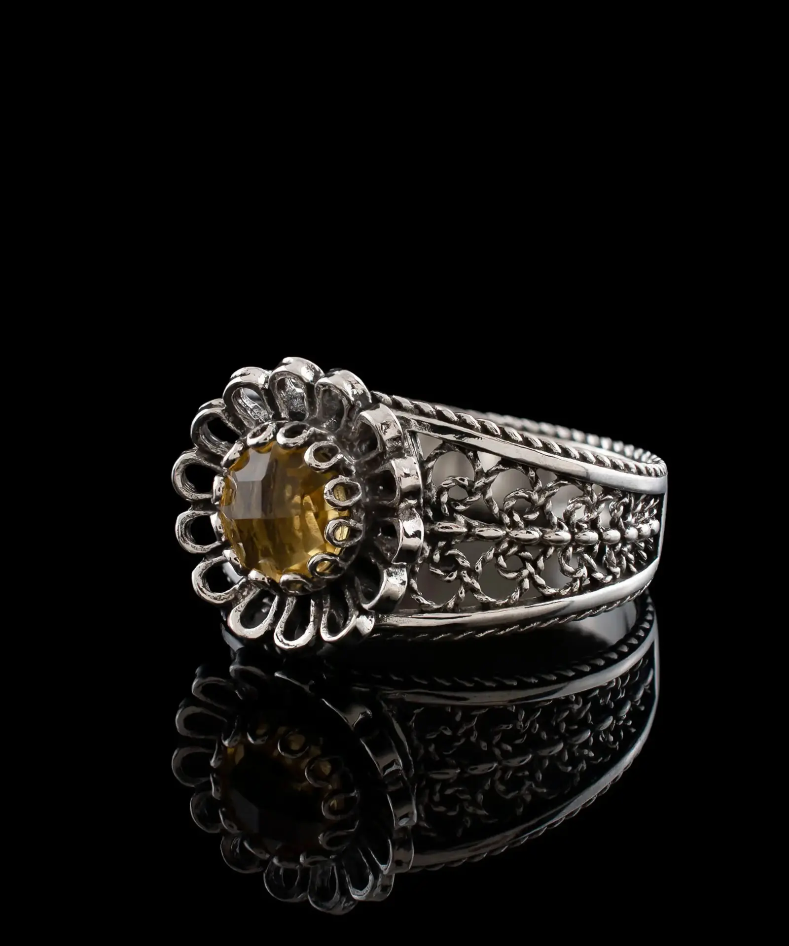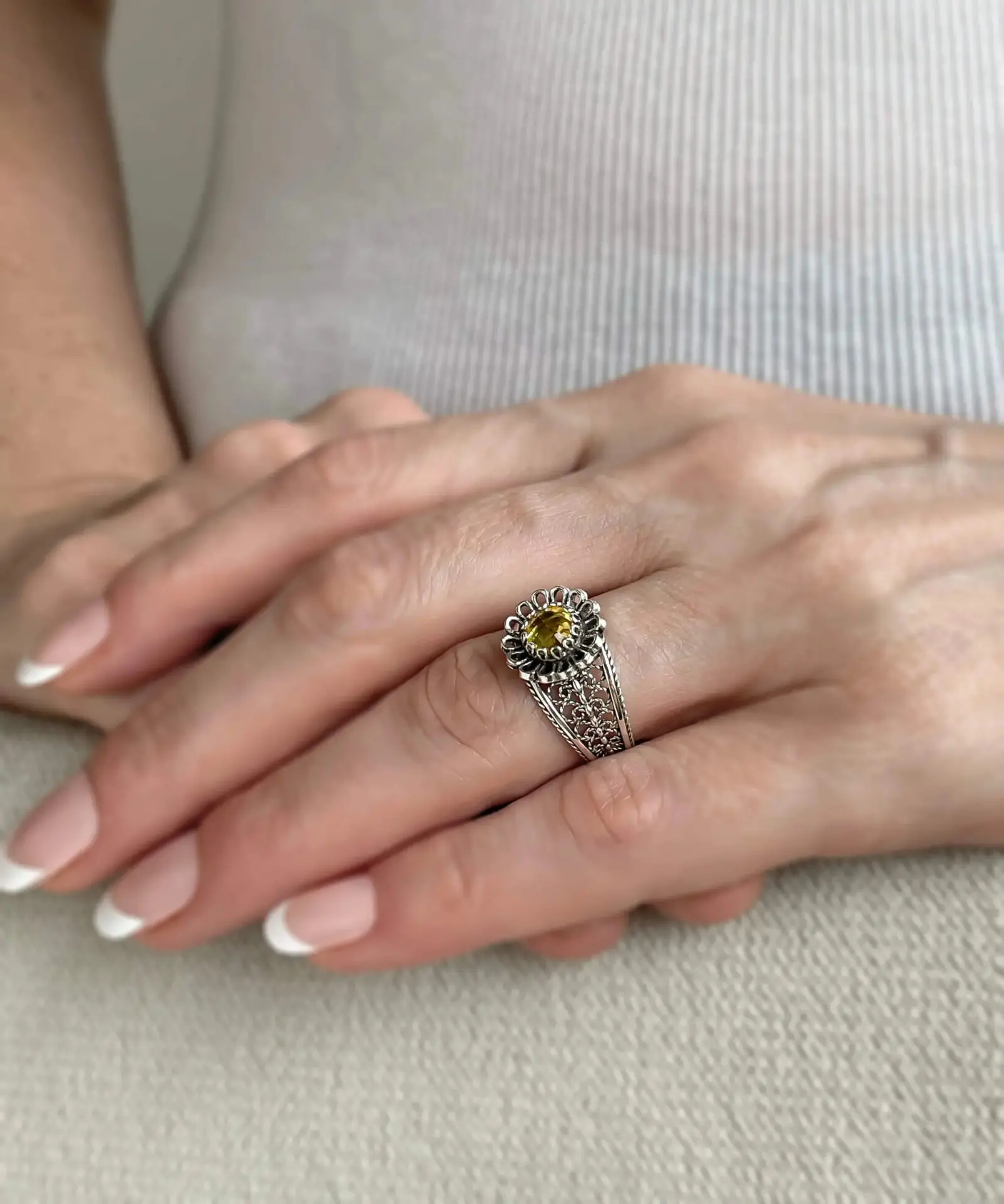 Add a touch of elegance to your jewelry collection with our stunning Filigree Cocktail Ring. This exquisite piece is crafted from high-quality 925 sterling silver and features an enchanting daisy pattern. The front of the dainty ring showcases a faceted, checkerboard round cut citrine gemstone, lending a unique and sophisticated touch to the ring.