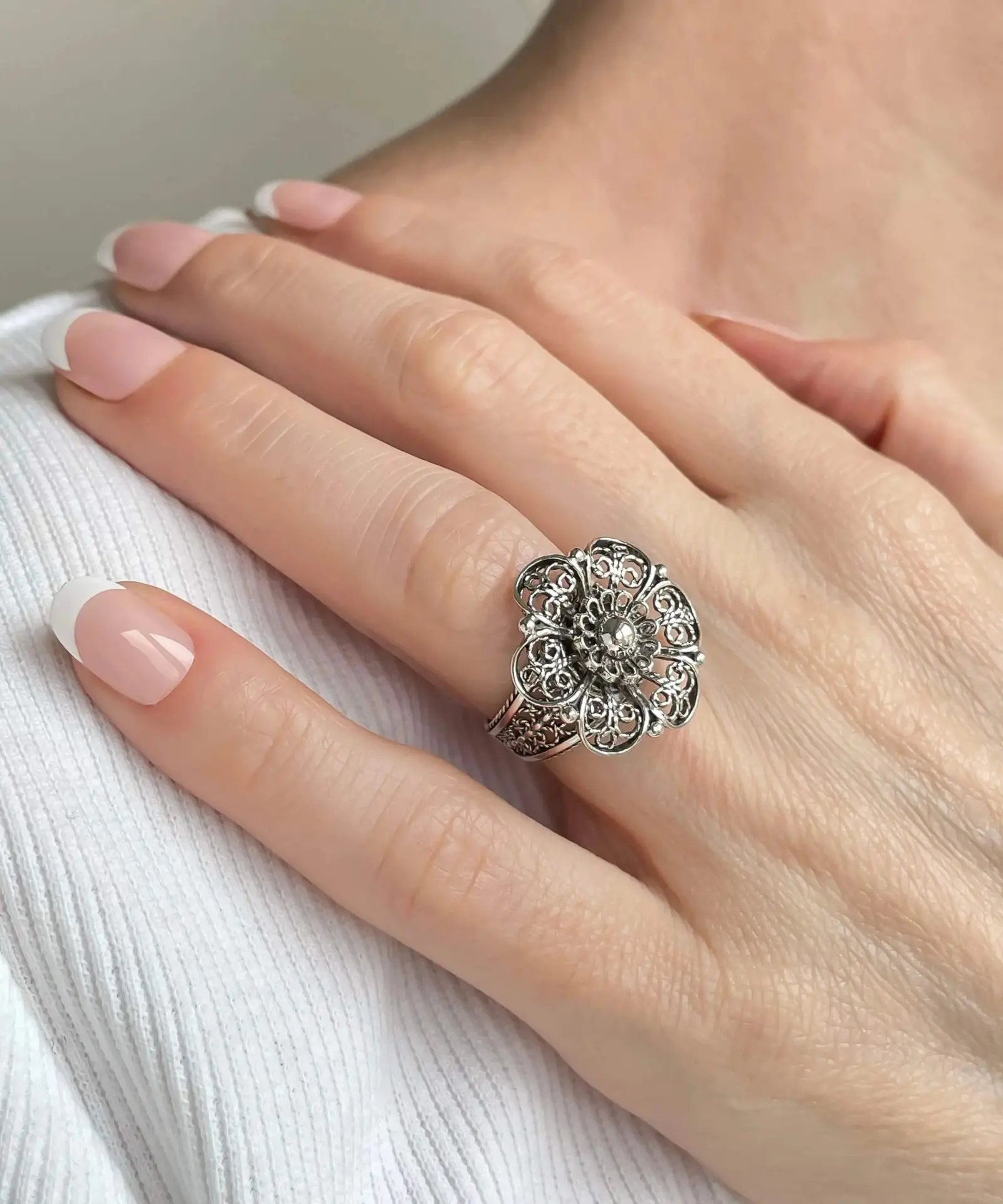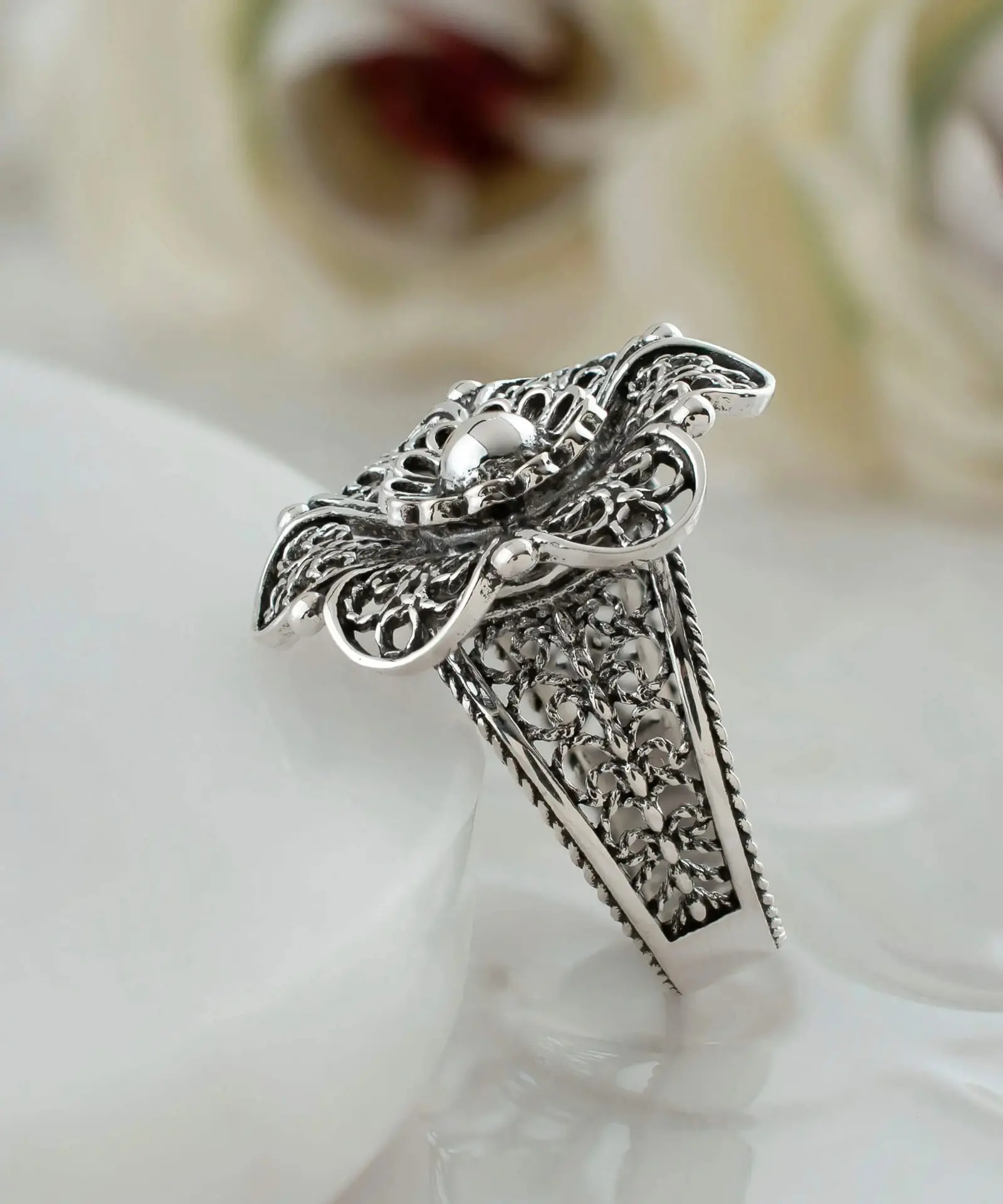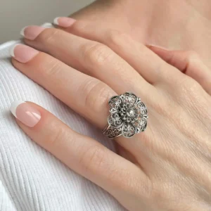 Our metal embroidery filigree ring is oxidized and polished to create a beautiful and long-lasting finish. Filigree is an ancient art form that involves delicate metal strands skillfully crafted to create an outstanding combination of old and modern art. Originating in Mesopotamia and Anatolia, it is a timeless art form that has been perfected over centuries.