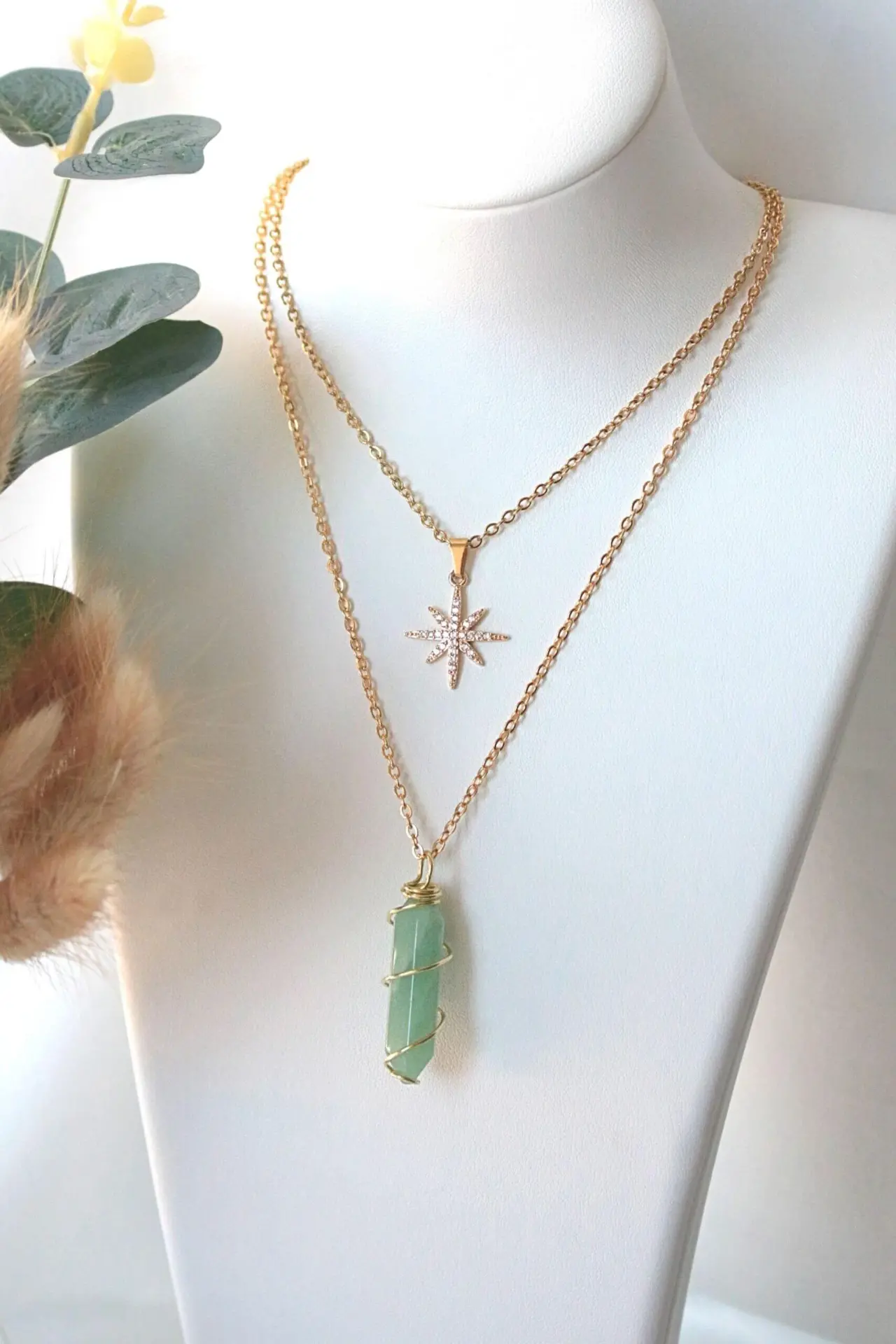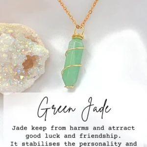 Healing crystal necklace with a double-ended carved pendant of natural crystals with healing properties and hand wired with 18 karat gold plated copper wire.