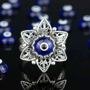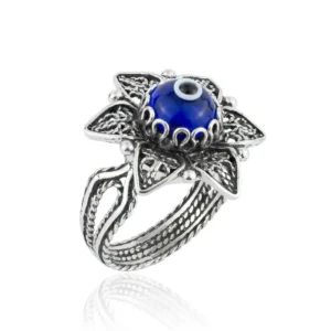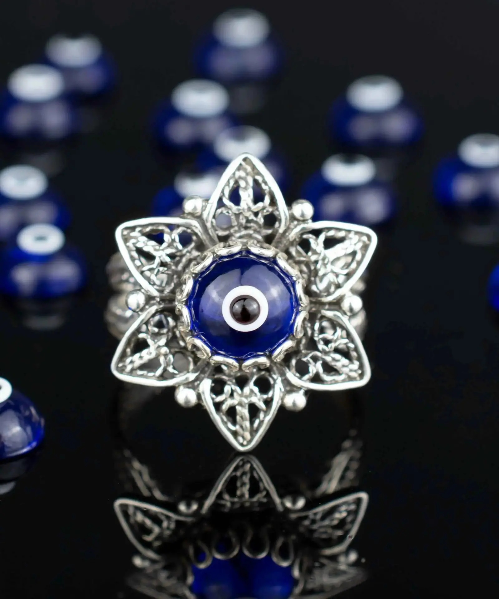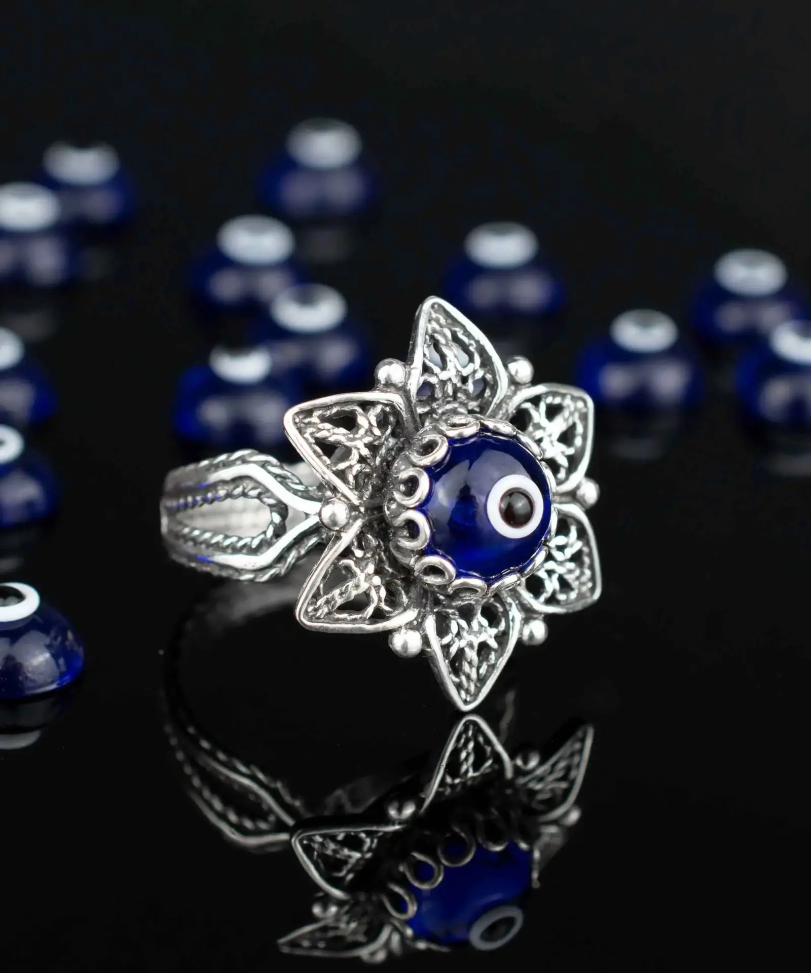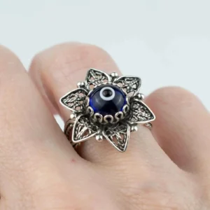 Elevate your everyday attire with this elegant cocktail ring that features a sophisticated daisy blossom lace embroidery design and an exquisite 8mm Murano glass blue evil eye bead. The ring is crafted from high-quality 925 sterling silver and measures 0.85 inches in diameter.