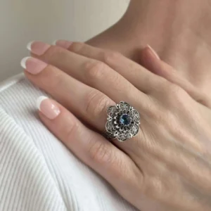 Elevate your femininity with this exquisite 925 sterling silver ring featuring a delicate and detailed lace daisy flower design and a stunning Blue Quartz gemstone. Perfect for any occasion, this elegant ring is an ideal accessory for daily use or special events such as weddings, engagements, and proms. Its simple yet sophisticated design also makes it an excellent gift option for holidays, birthdays, or any other celebrations.