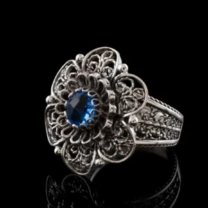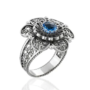 This metal embroidery filigree ring is 0.86″ / 22.00 mm in length and features a 6 mm Blue Quartz gemstone that is double side faceted and checkerboard round-cut. The ring is oxidized and highly polished to add a touch of vintage charm.