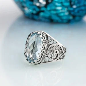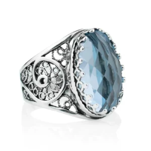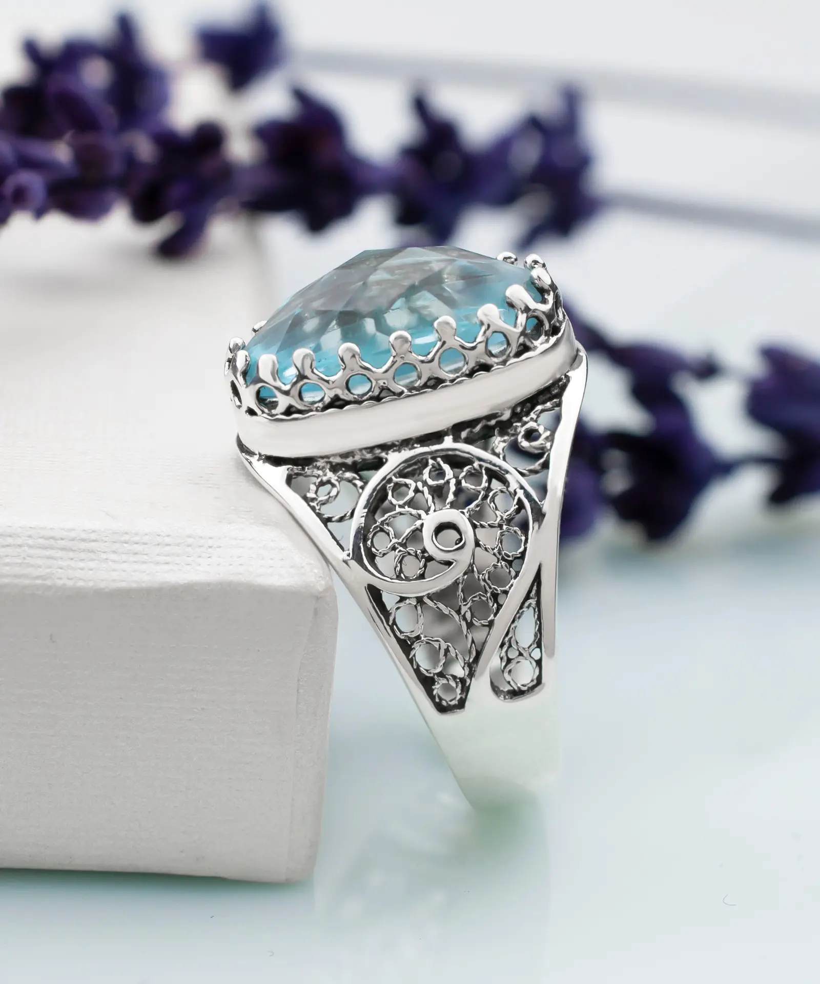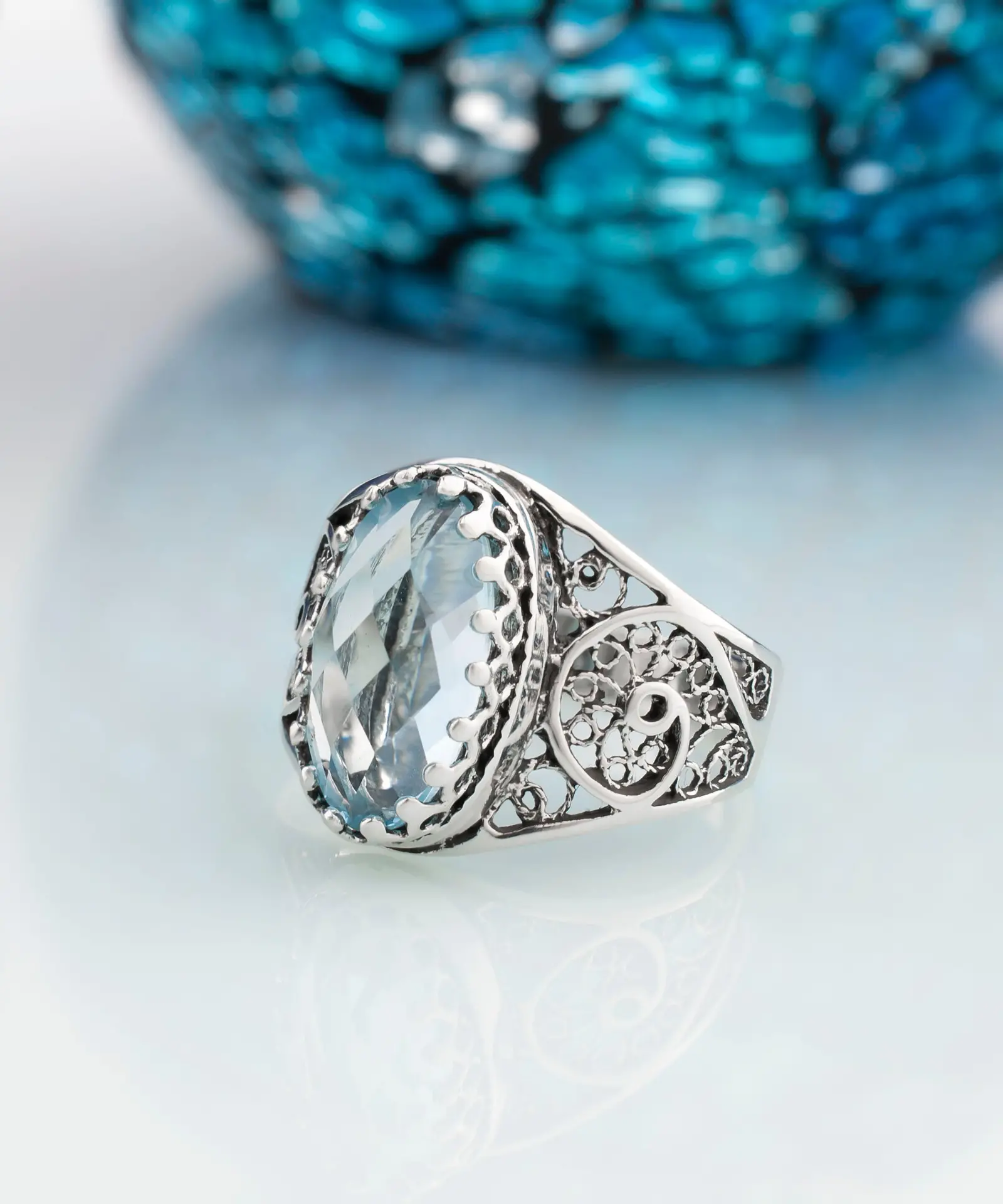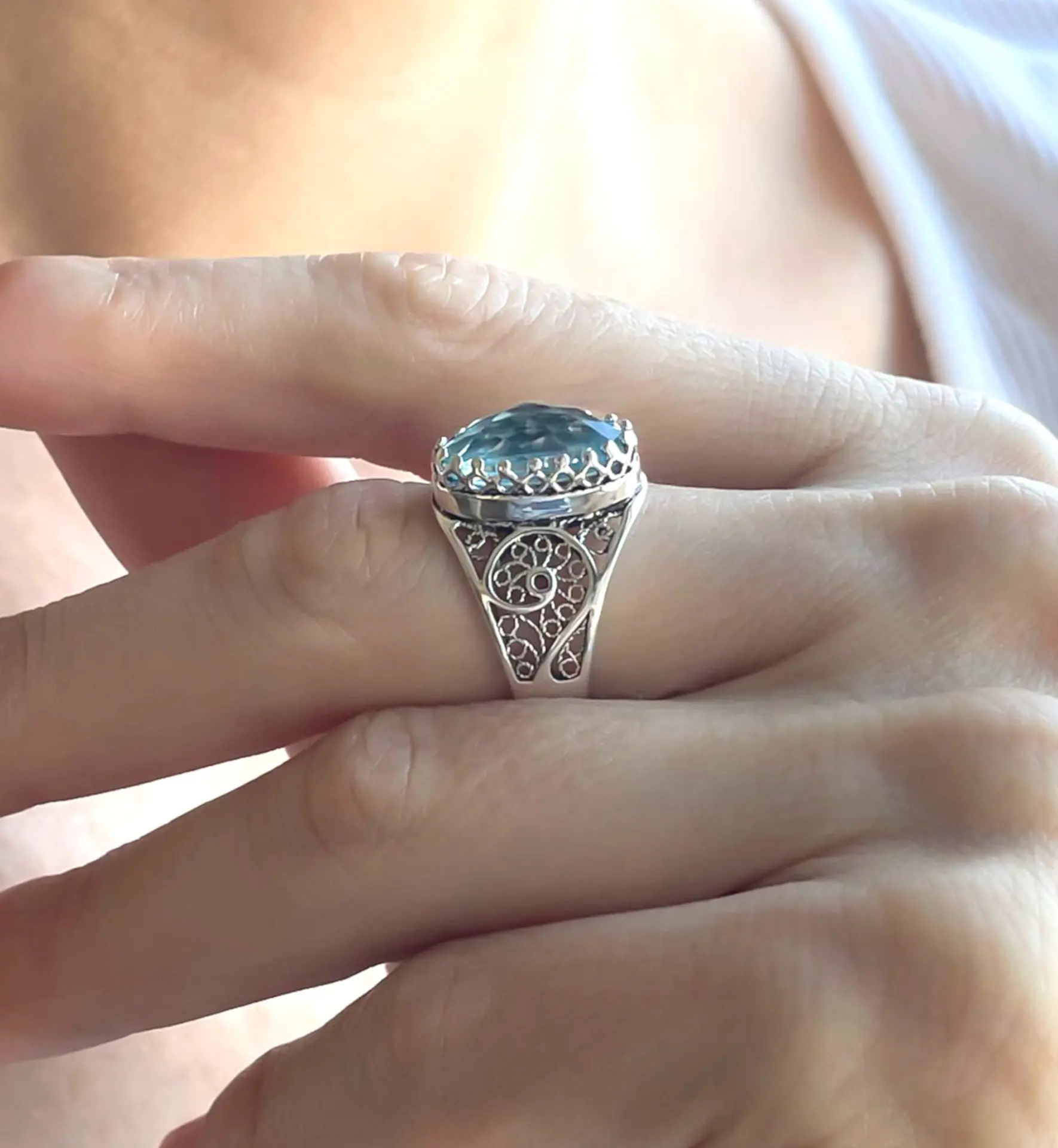 Elevate your style with our 925 sterling silver handmade filigree art Blue Topaz gemstone oval design women’s statement silver ring. This exquisite piece combines timeless elegance and vibrant color to create a unique accessory.