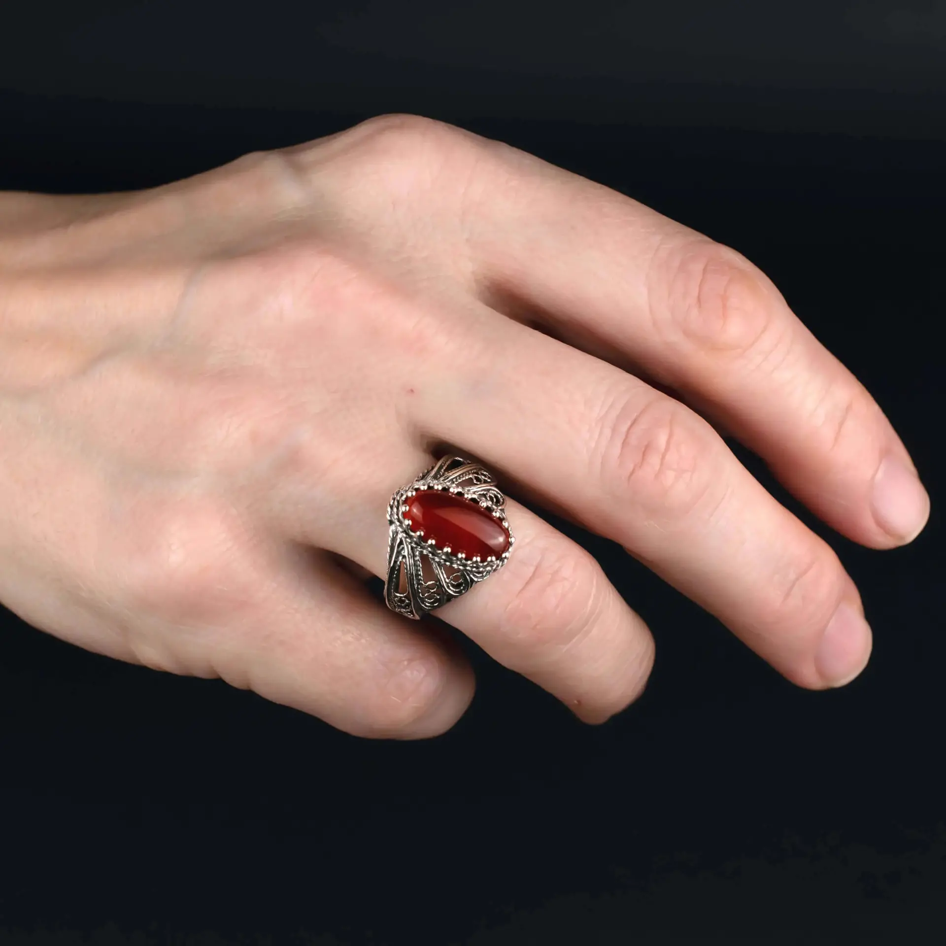 Elevate your style with the 925 Sterling Silver Filigree Art Carnelian Gemstone Angel Wings Cocktail Ring. This ring, crafted from high-quality 925 sterling silver, boasts a stunning filigree art design. At its center, you’ll find a captivating 7×14 mm cabochon oval-cut Carnelian gemstone, known for its protective properties and its grounding and stabilizing effects.