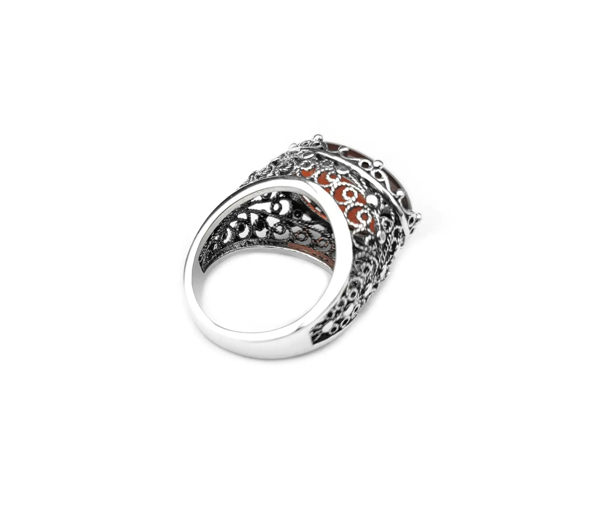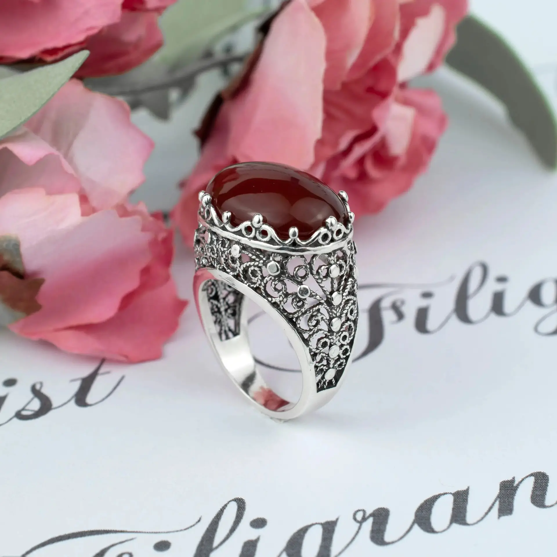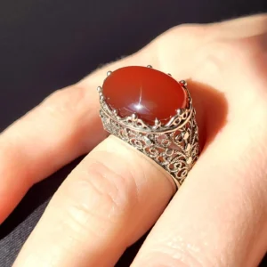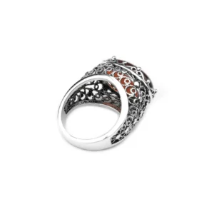 Indulge in our handmade filigree statement ring featuring radiant natural carnelian – an artful adornment to treasure.