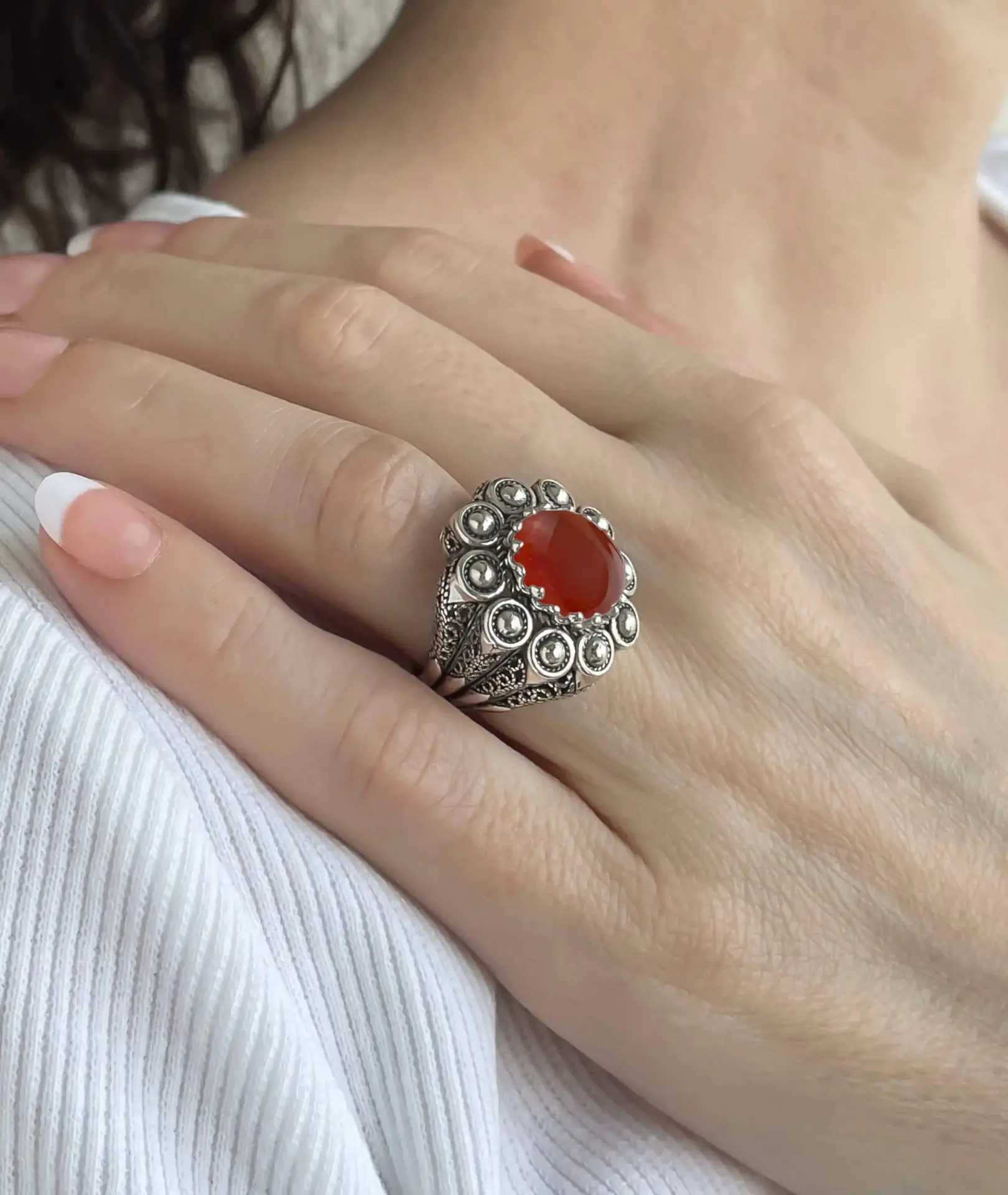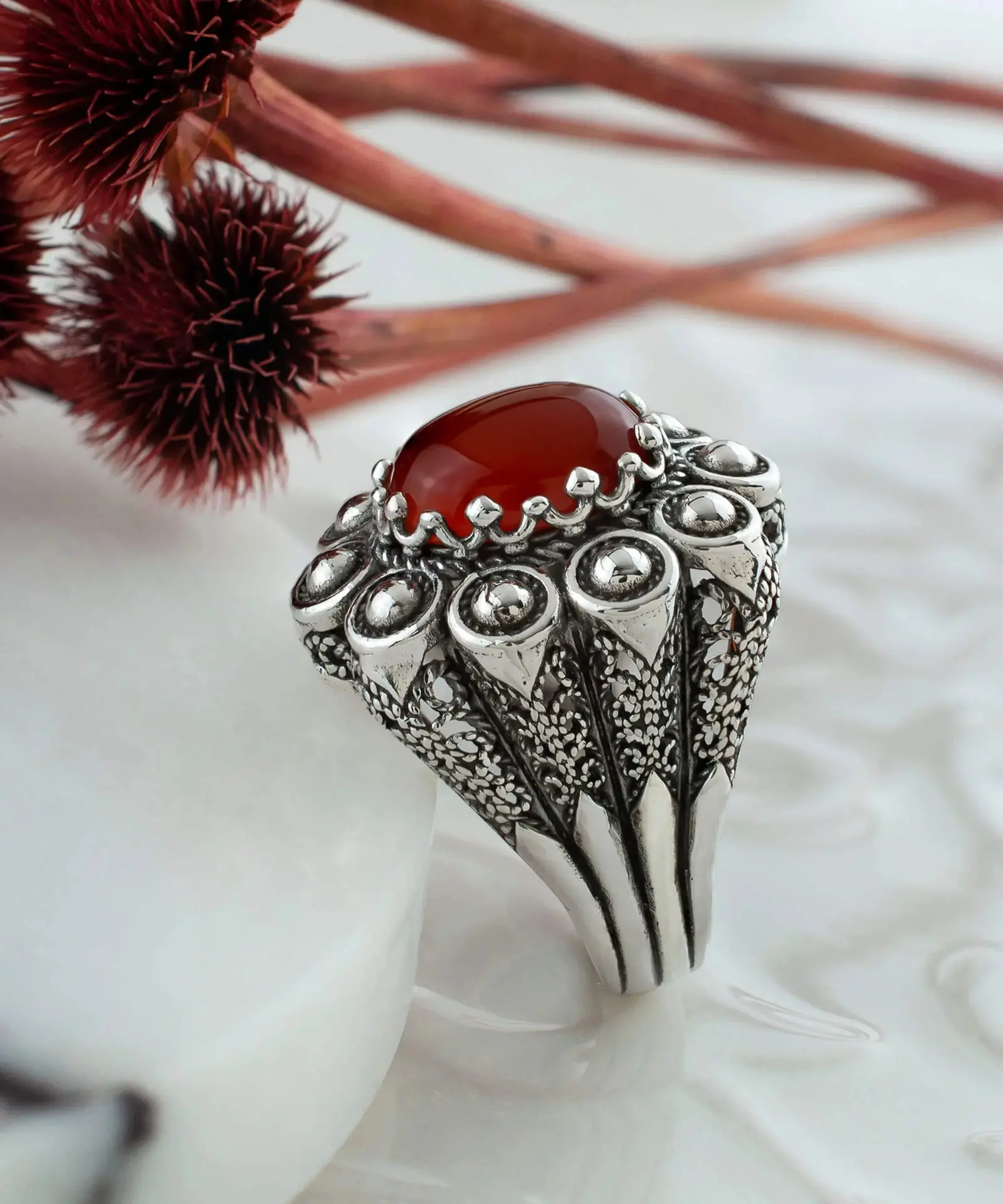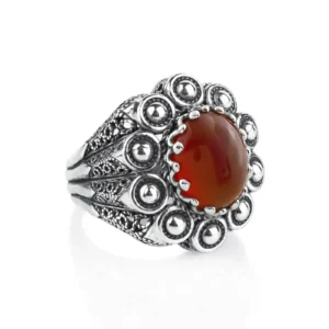 Indulge in the beauty and craftsmanship of our handcrafted Embroidery Ring with Carnelian Gemstone. This exquisite ring is made of high-quality 925 sterling silver and features intricate filigree art, skillfully oxidized for an antique finish.