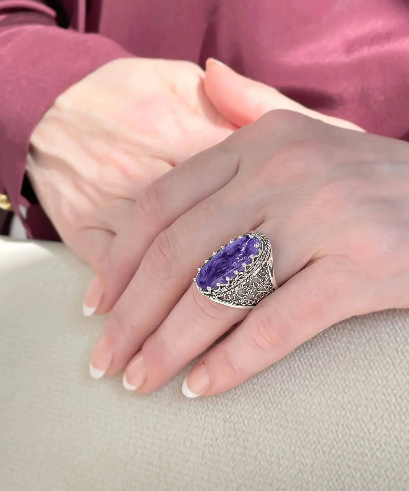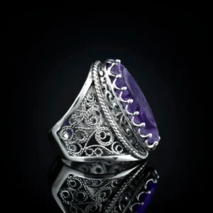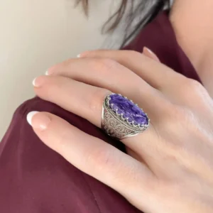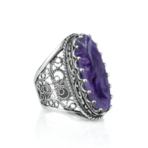 Seize the opportunity to add this stunning piece to your collection. Shop now and transform your style with our 925 Sterling Silver Filigree Art Charoite Gemstone Women Long Statement Ring.