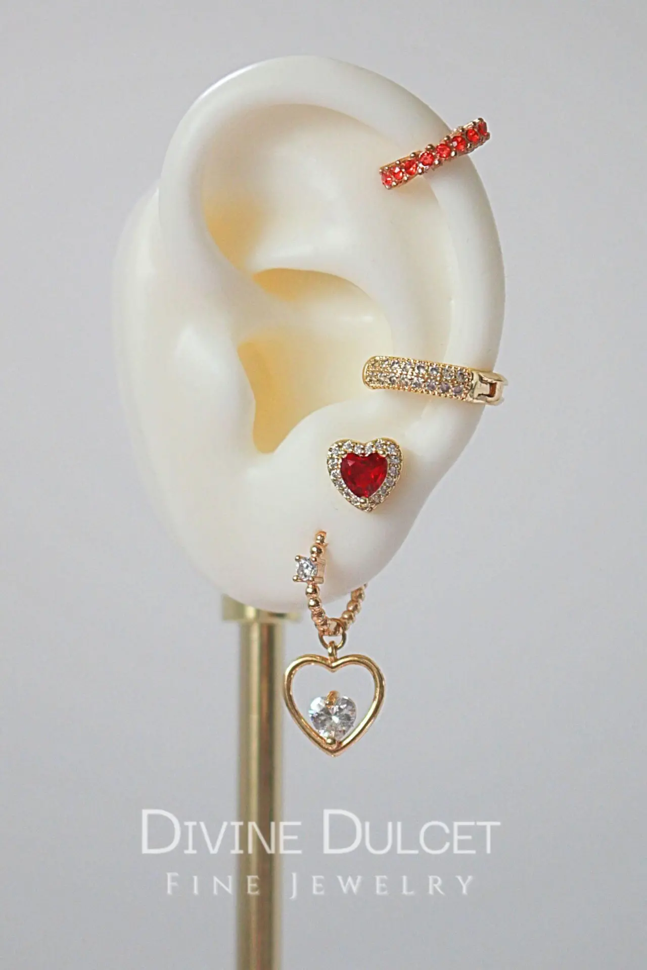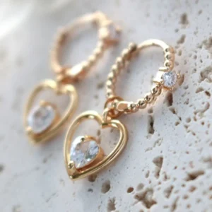 Lovely heart hoop earrings with cute heart charm inlaid with diamond cut colorless cubic zirconia that cause beautiful sparkles against the light.