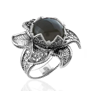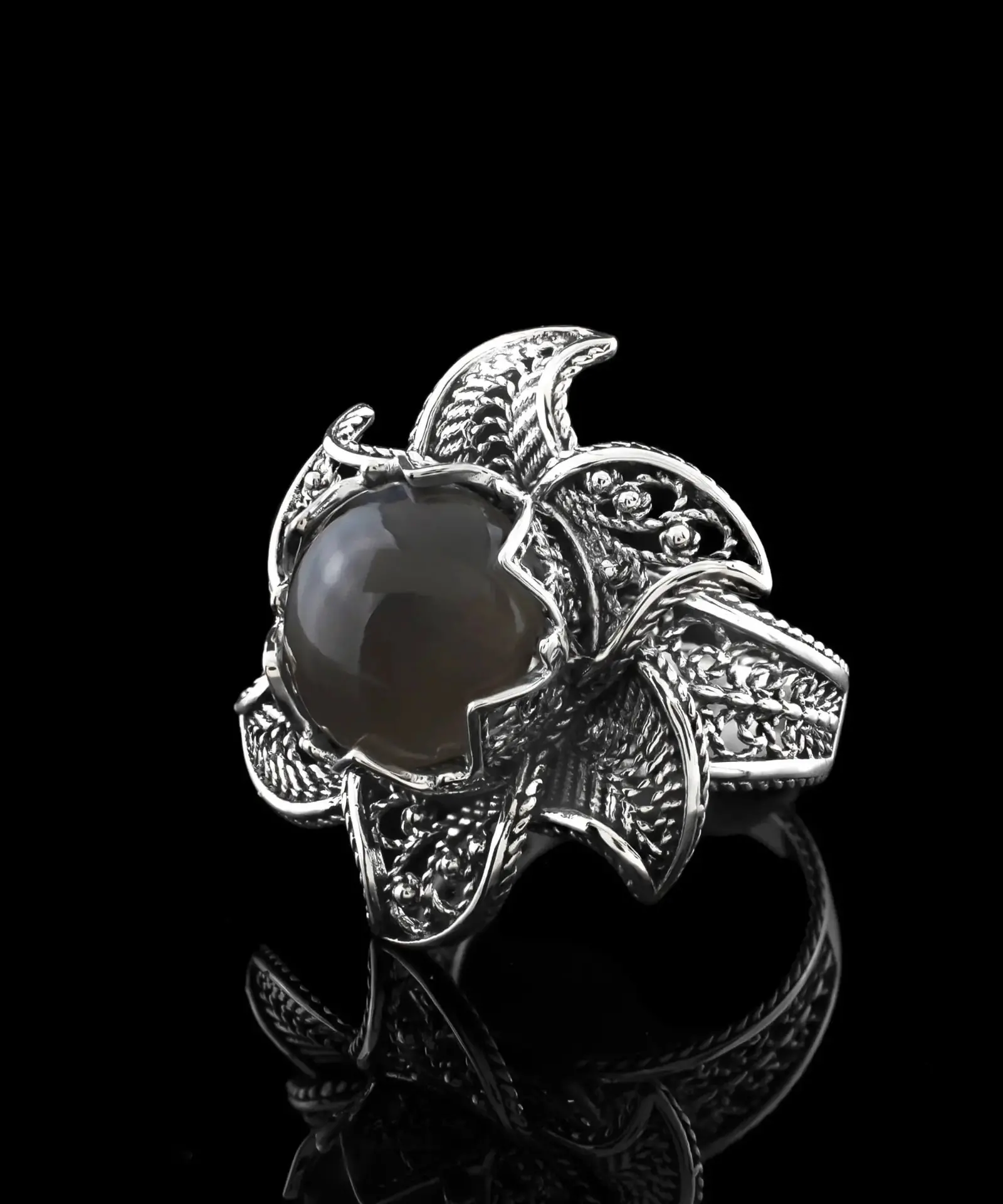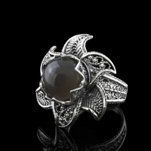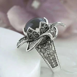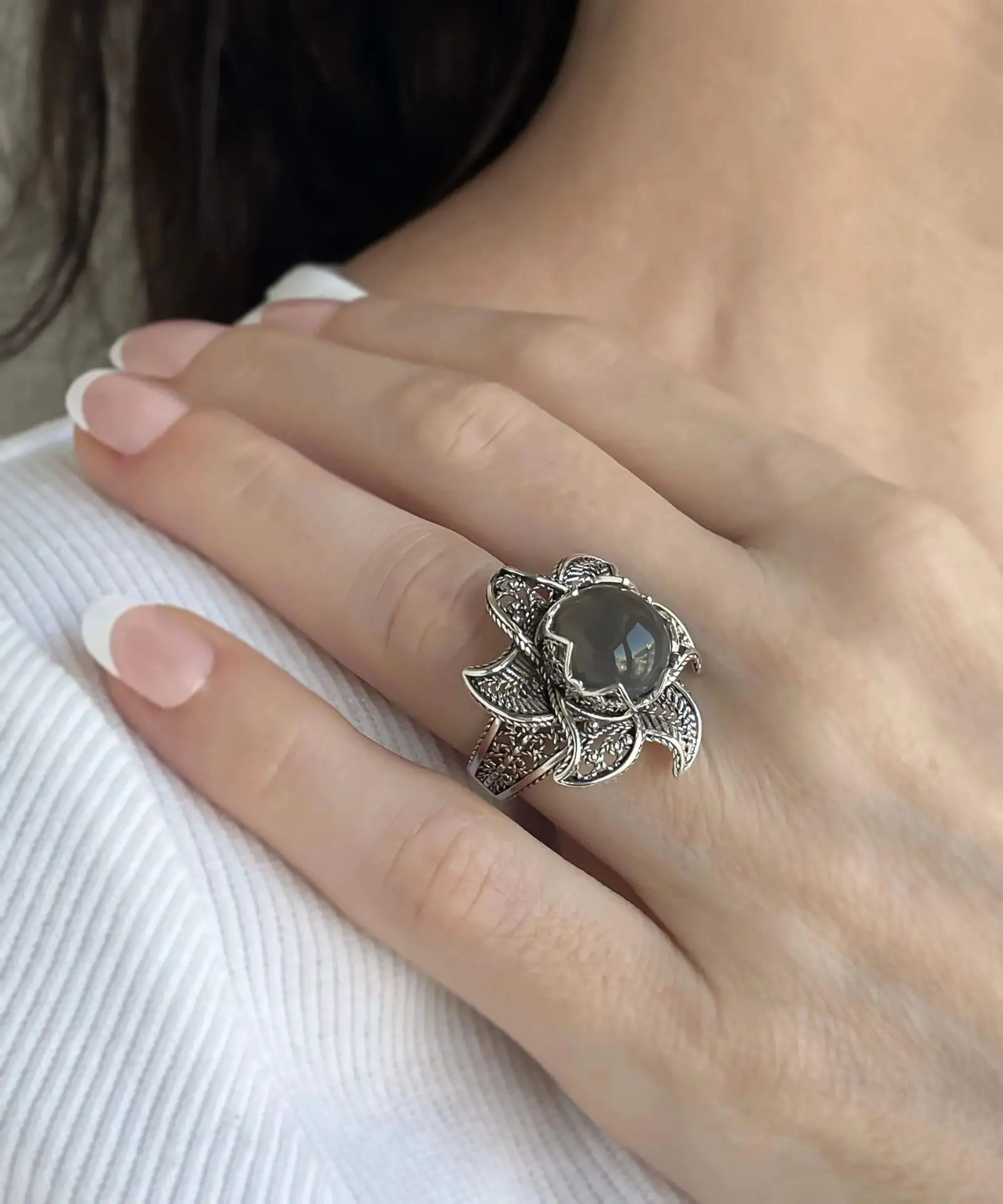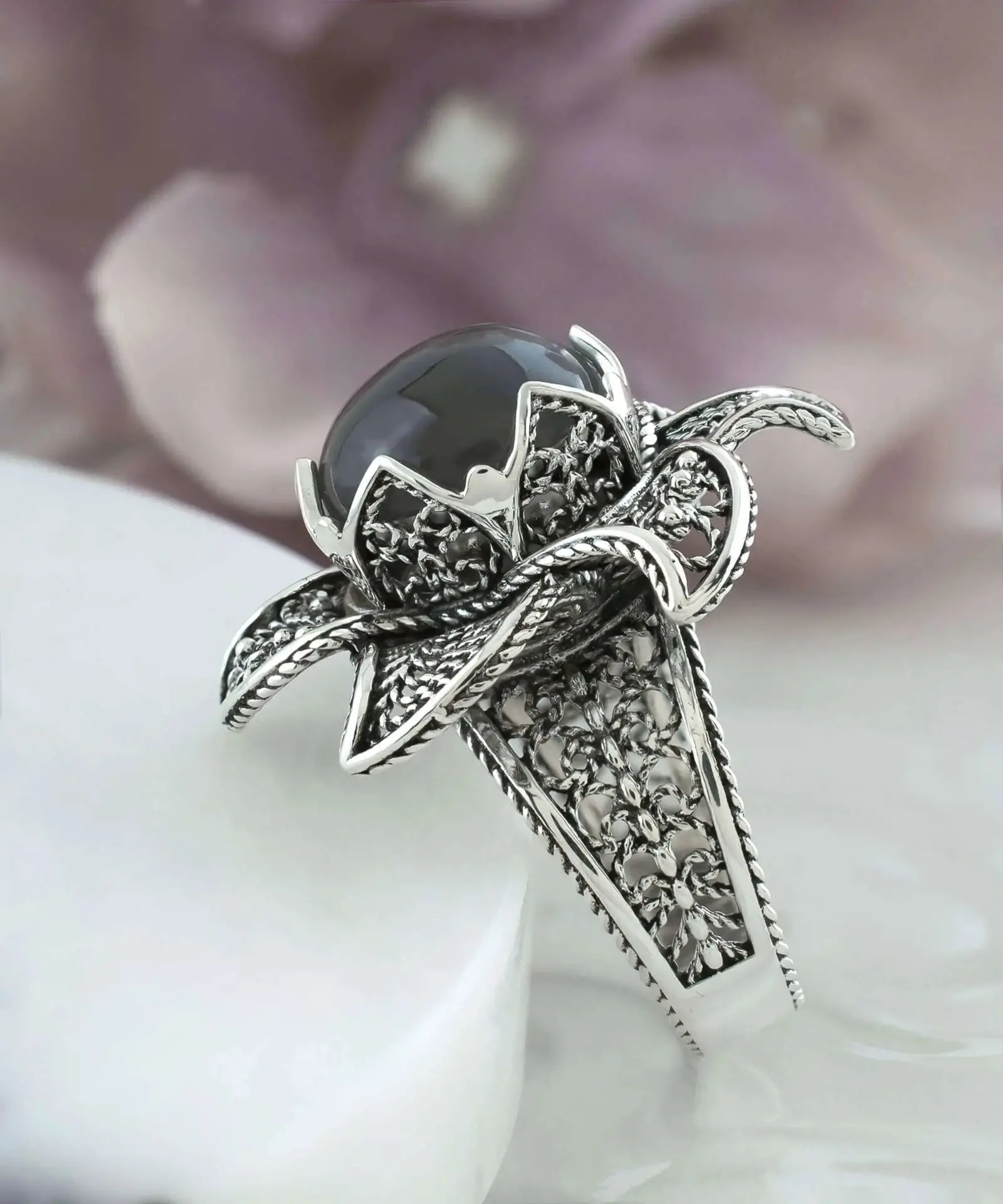 Upgrade your jewelry collection with The Filigranist 925 Sterling Silver Lotus Flower Women Ring featuring a stunning Gray Moonstone gemstone. This cocktail ring is crafted with high-quality materials and expert craftsmanship, making it the perfect accessory for any occasion. The Gray Moonstone gemstone is 12 mm and cabochon round-cut, and its natural beauty is accentuated by the ring’s enchanting details.