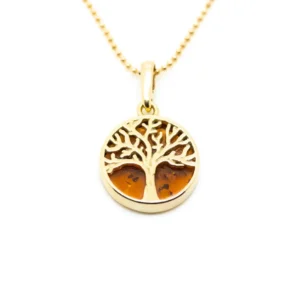 This dainty Amber charm pendant is the perfect stacking necklace for everyday wear. Featuring a small round baltic amber piece, overlaid with a gold plated sterling silver tree of life icon.