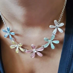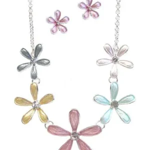 This Multi Flower Necklace Set features a silver multi-tone construction, elegant pastel flowers, and crystal insets. The necklace is 18″ + 2″ extender, with matching flower earrings included.