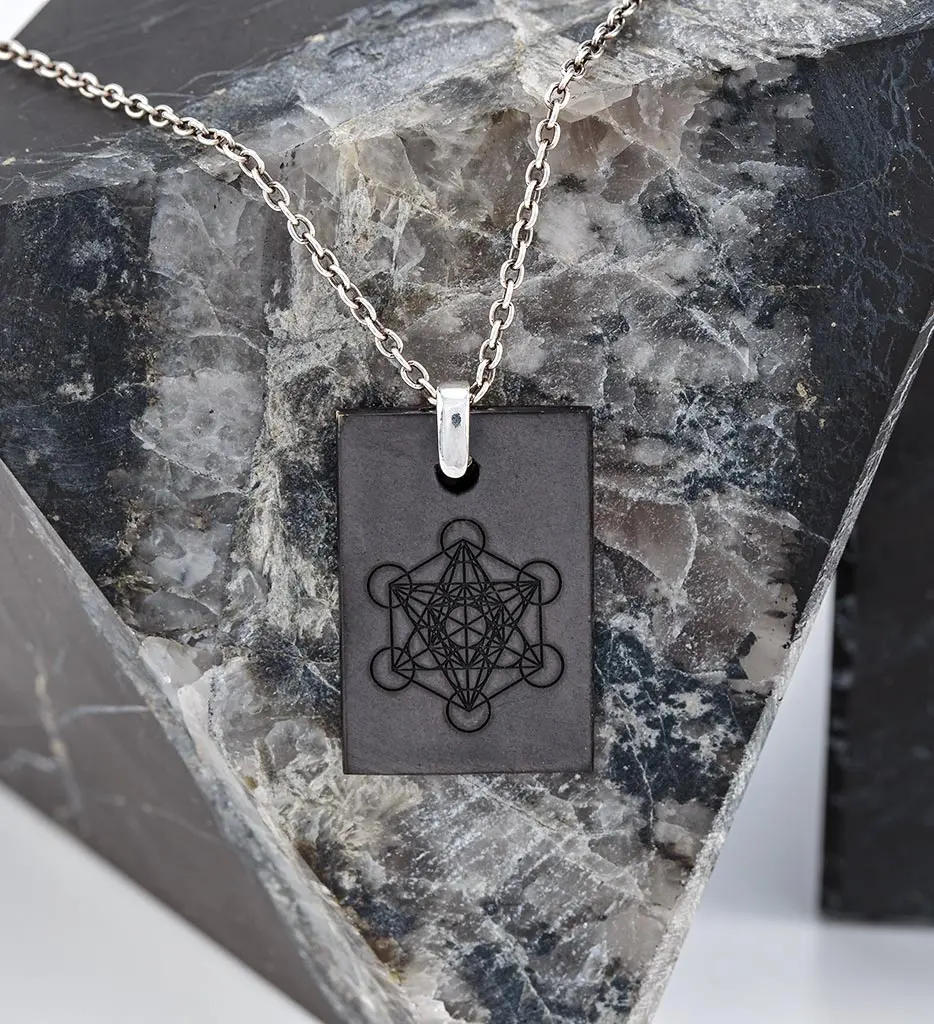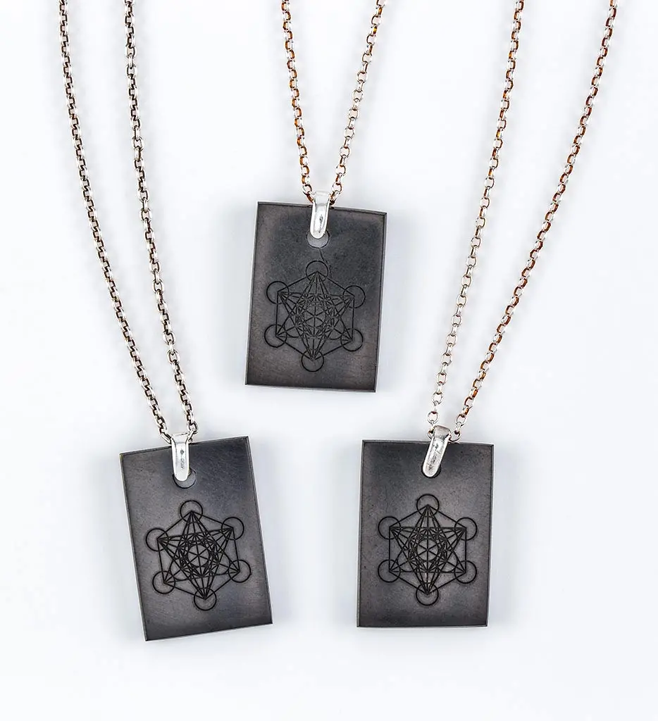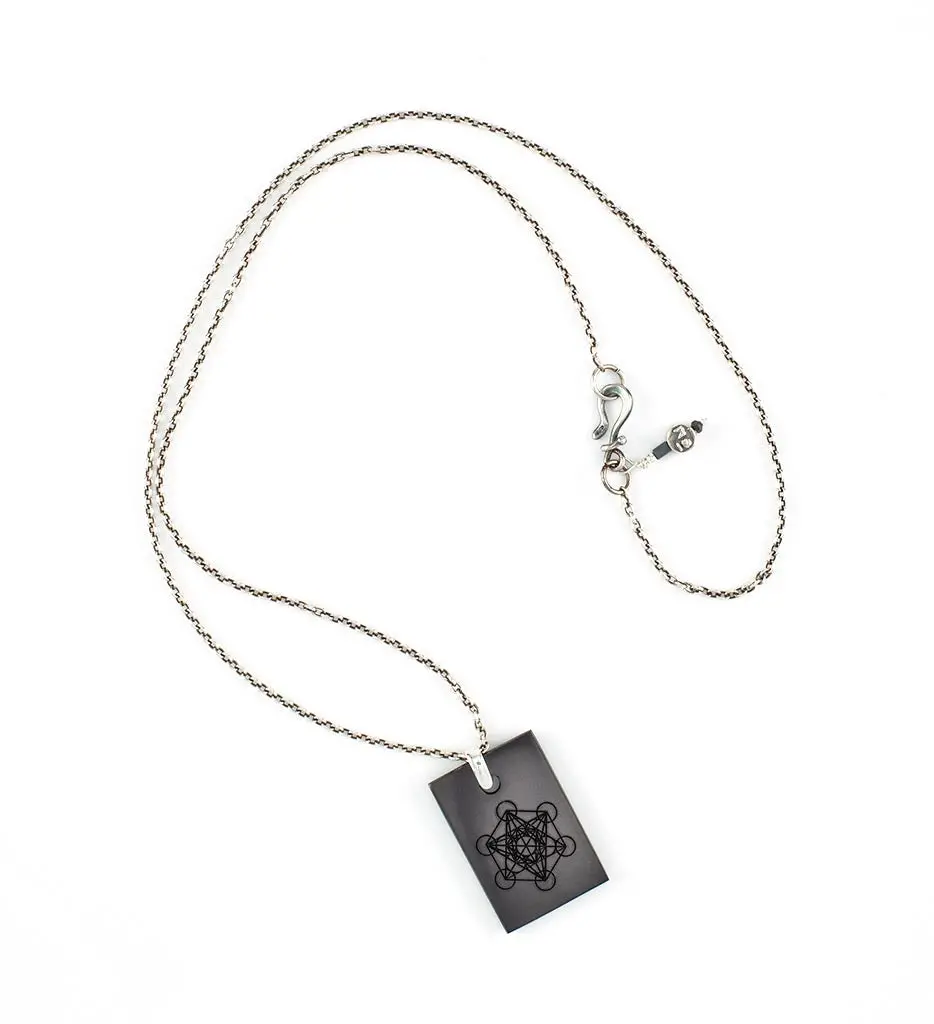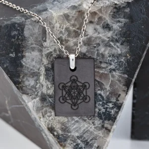 The pendant is engraved with Metatrons Cube, asacred geometry symbol that is a 2-dimensional image of the 3-dimensionality of space represents earth, air, water, fire, & spirit, the building blocks of the universe.It symbolizes the unity of the finite with the infinite and is often used in meditation to amplify energy flow and connect to balanced state within.