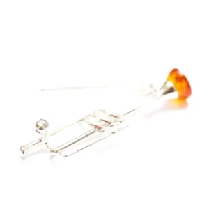 A beautifully handcrafted sterling silver brooch, fashioned in the shape of a trumpet and decorated with a small baltic amber piece.